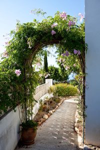 The house appears, a dazzling white against the bluest of skies, adorned with bougainvillea, ancient olive trees and exotic succulents.