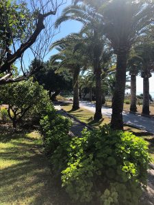 The imposing private entrance by gates opens onto a long private driveway, fringed with stunning mature palm trees.